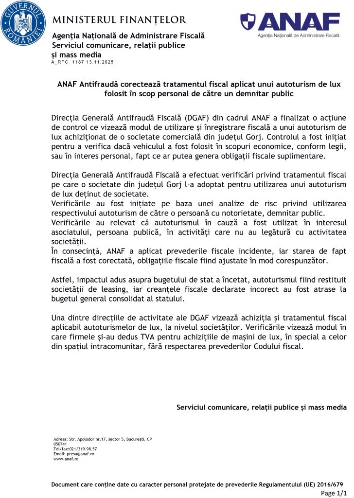 În urma verificărilor, ANAF a stabilit că autoturismul a fost utilizat pentru scopuri personale, nu în activitatea economică a firmei, iar tratamentul fiscal aplicat a fost corectat, ajustându-se obligațiile către bugetul de stat pentru creanțele declarate incorect.