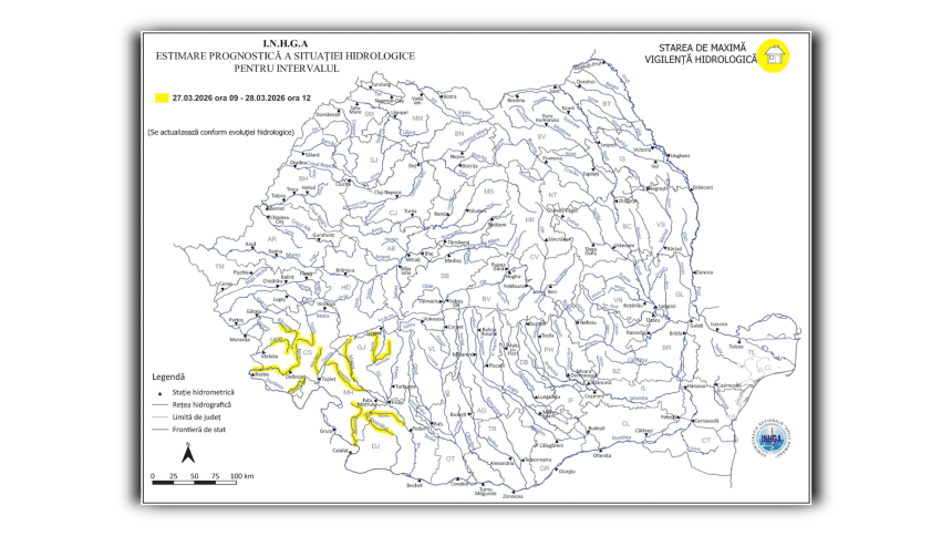 Codul galben vizează sectoare de râuri din județele Gorj, Caraș-Severin, Mehedinți și Dolj. Fenomenele periculoase pot avea intensitate mai mare în intervalul 27 martie, ora 21:00, până pe 28 martie, ora 12:00, în special pe râuri mici.