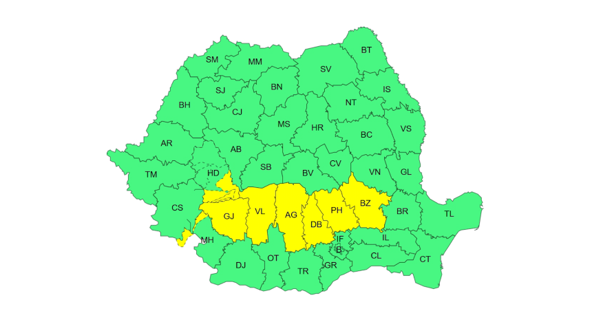 Administrația Națională de Meteorologie a emis o avertizare Cod Galben, valabilă până duminică, 30 noiembrie, ora 20:00, pentru mai multe județe, inclusiv Gorj.