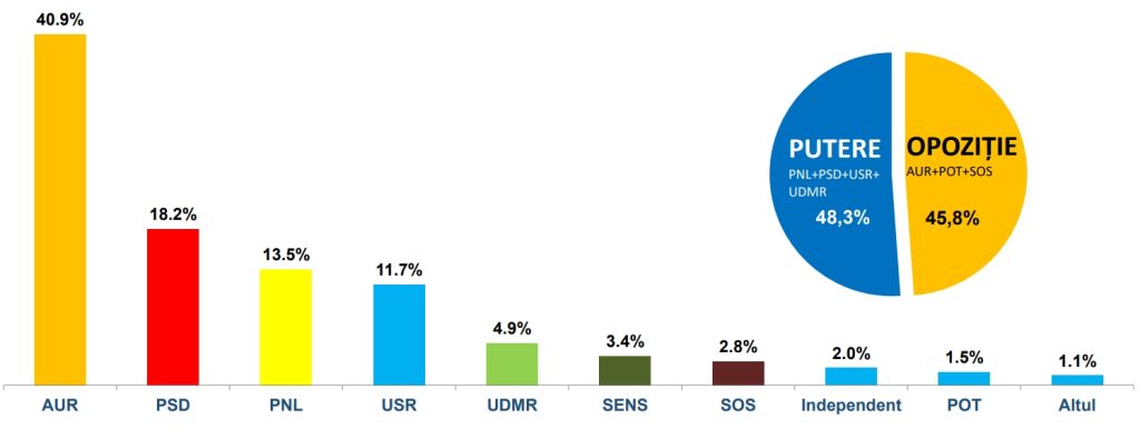 Un sondaj INSCOP Research realizat între 12 și 15 ianuarie arată că partidul AUR conduce în preferințele alegătorilor, cu 40,9% dintre respondenți care ar vota formațiunea.