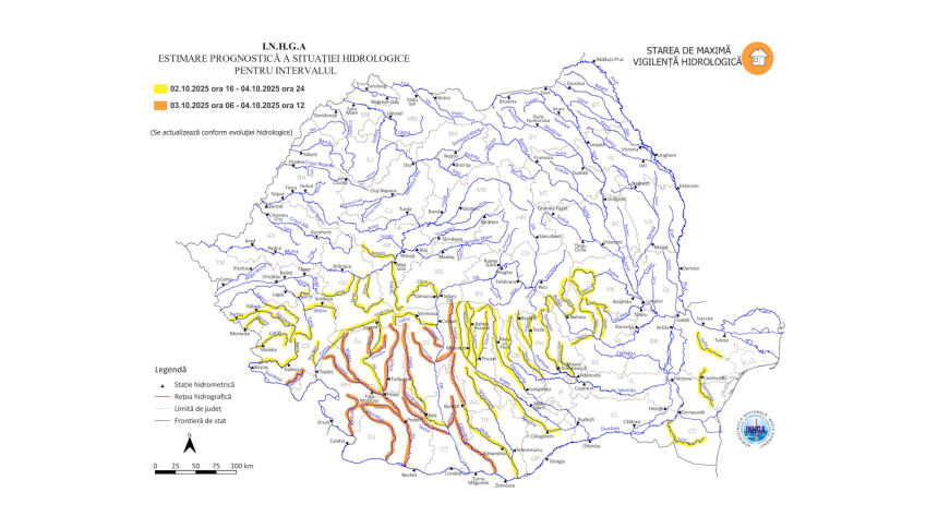 Institutul Național de Hidrologie și Gospodărire a Apelor a emis avertizări hidrologice pentru mai multe județe, inclusiv Gorj. Din 3 octombrie, ora 06:00, până pe 4 octombrie, ora 12:00, este Cod Portocaliu de inundații, vizând viituri rapide, scurgeri pe versanți și creșteri importante de debite.